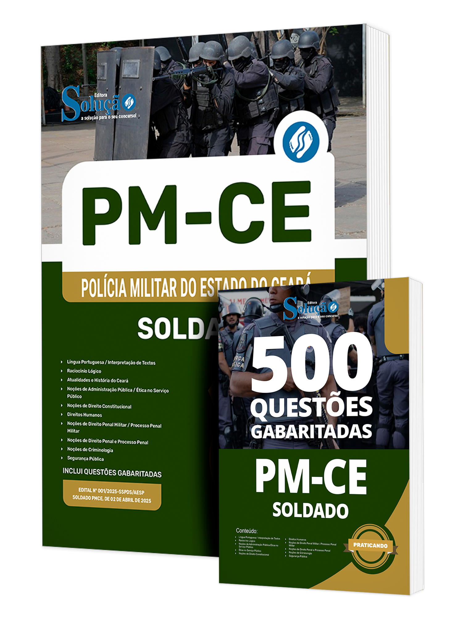 - Caderno de Questões PM-CE - Soldado - 500 Questões Gabaritadas: são questões cuidadosamente escolhidas pela nossa equipe editorial, com ampla experiência em concursos públicos. Estruturado de forma a facilitar o aprendizado e potencializar seus estudos!