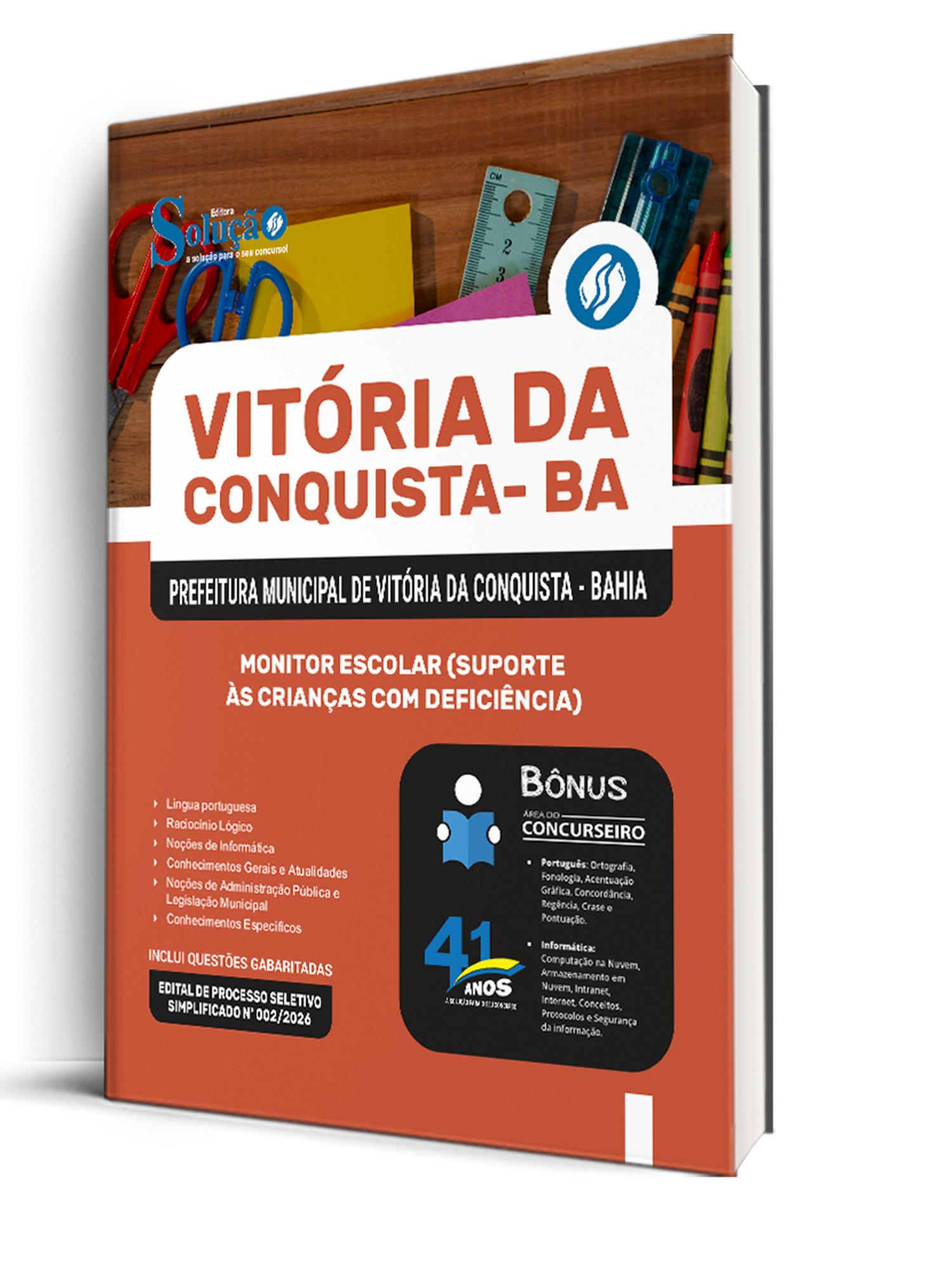 - Apostila Prefeitura de Vitória da Conquista - BA 2026 - Monitor Escolar (Suporte às Crianças com Deficiência): traz toda a teoria necessária de forma escrita e com exercícios; de acordo com o último edital e elaborado por nossa equipe de professores especializados em concursos.