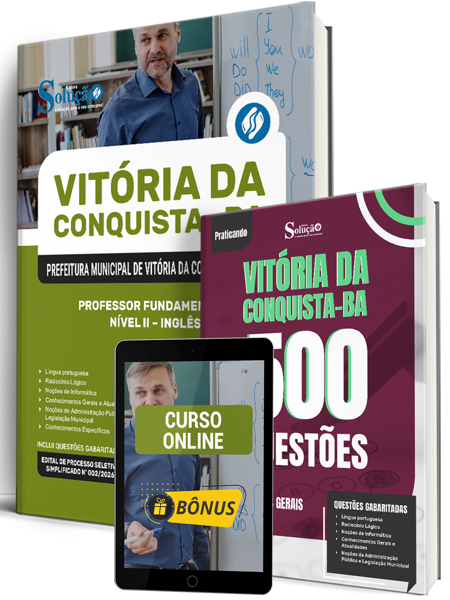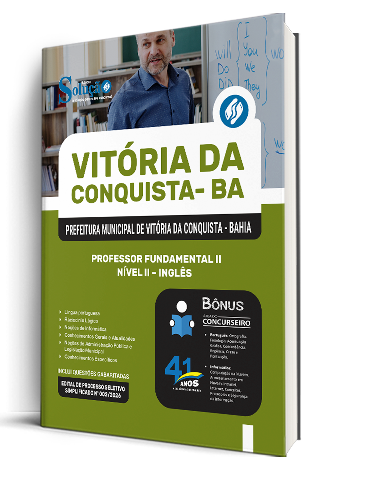 - Apostila Prefeitura de Vitória da Conquista - BA 2026 - Professor Fundamental II Nível II - Inglês: traz toda a teoria necessária de forma escrita e com exercícios; de acordo com o último edital e elaborado por nossa equipe de professores especializados em concursos.