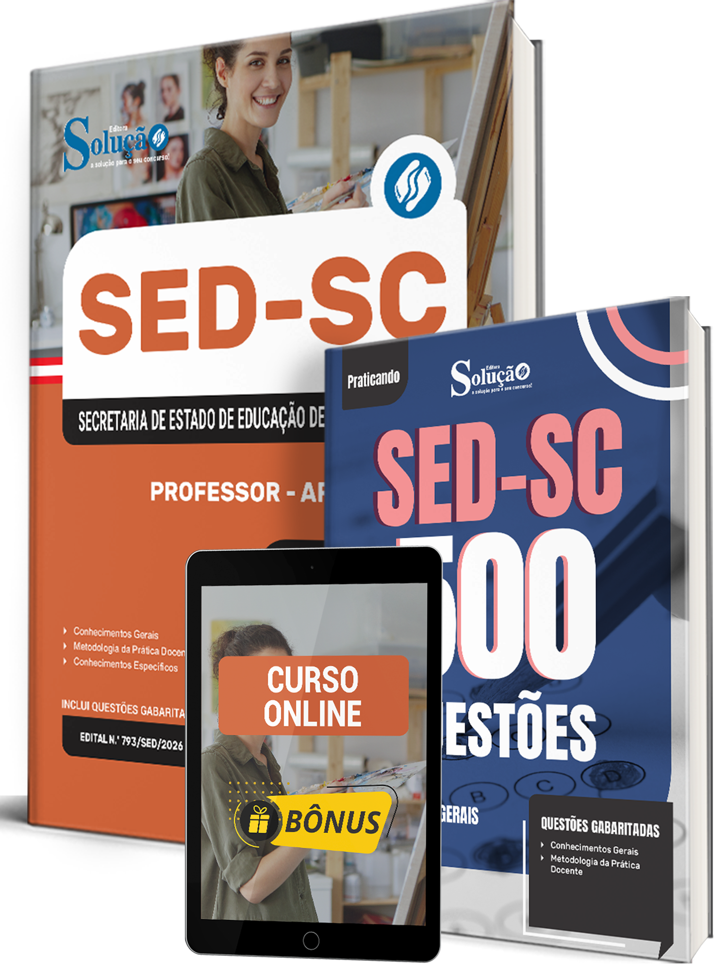 - Caderno de Questões SED-SC - Conhecimentos Gerais - 500 Questões Gabaritadas: traz questões cuidadosamente selecionadas pela nossa equipe editorial, de acordo com o edital mais recente do concurso.