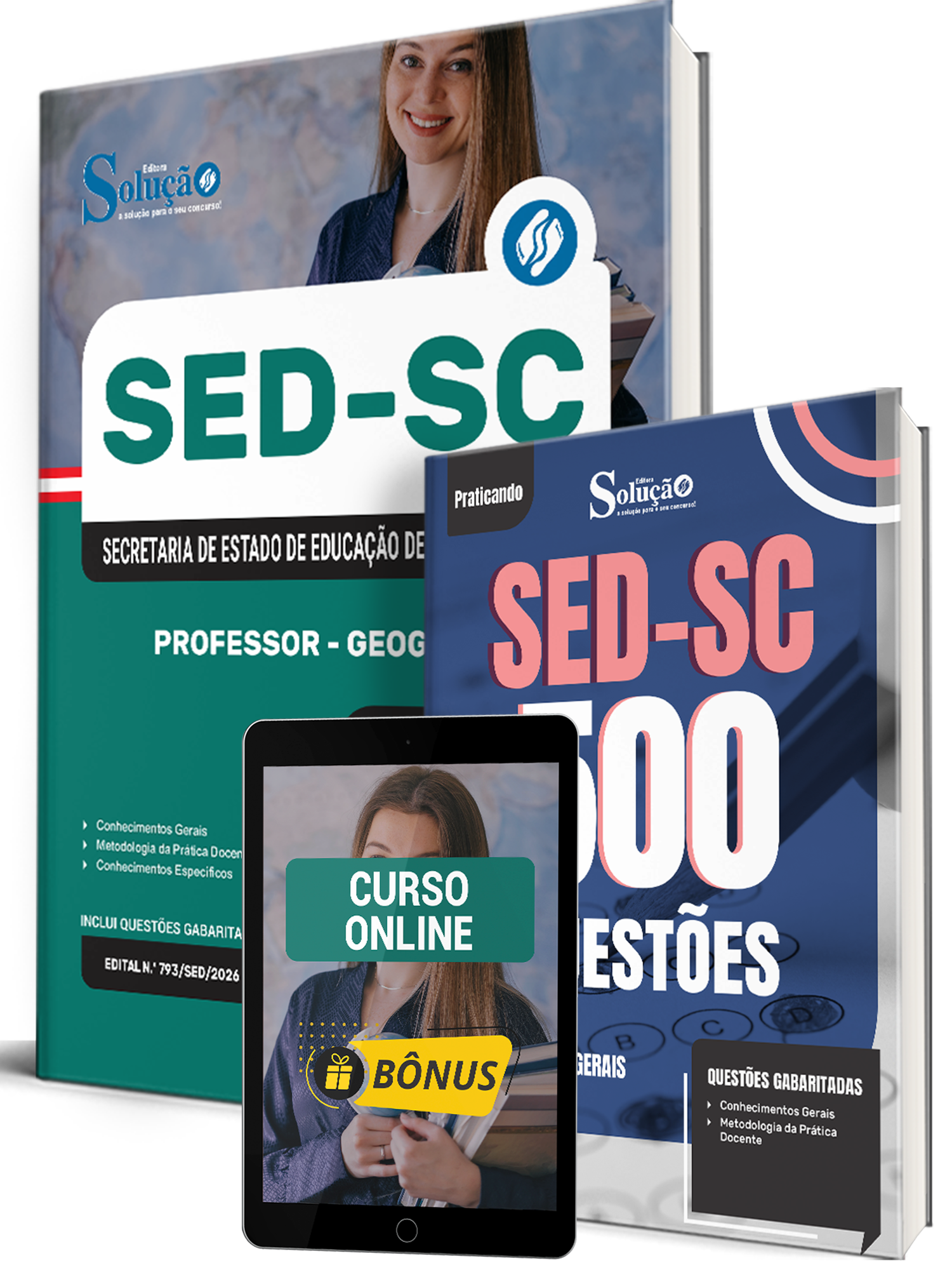 - Caderno de Questões SED-SC - Conhecimentos Gerais - 500 Questões Gabaritadas: traz questões cuidadosamente selecionadas pela nossa equipe editorial, de acordo com o edital mais recente do concurso.