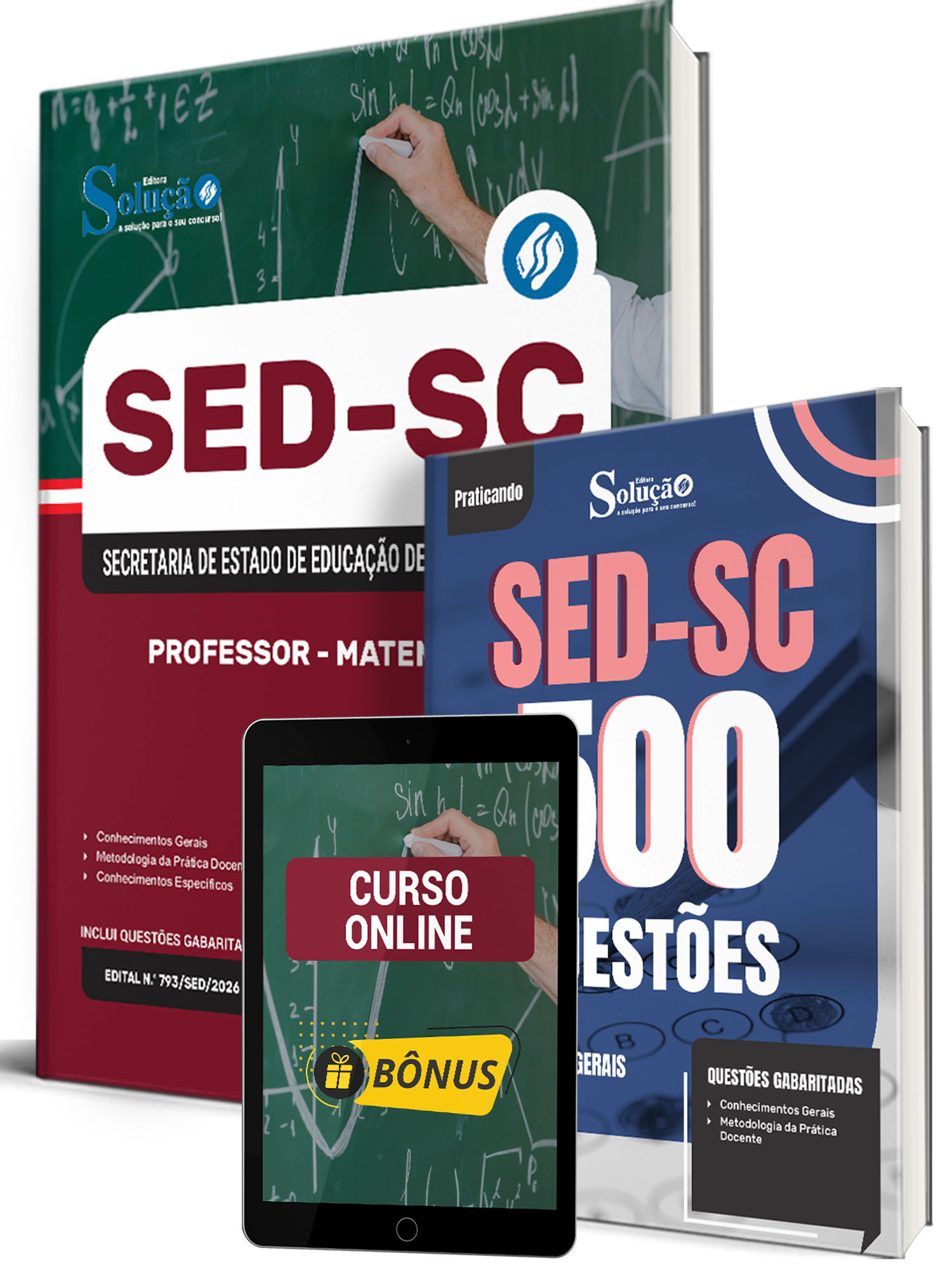 - Apostila SED-SC 2026 - Professor - Matemática: traz toda a teoria necessária de forma escrita e com exercícios; de acordo com o último edital e elaborado por nossa equipe de professores especializados em concursos.