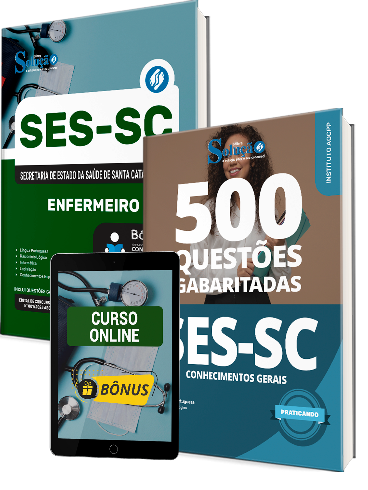 - Apostila SES-SC 2025 - Enfermeiro: traz toda a teoria necessária de forma escrita e com exercícios; de acordo com o último edital e elaborado por nossa equipe de professores especializados em concursos.