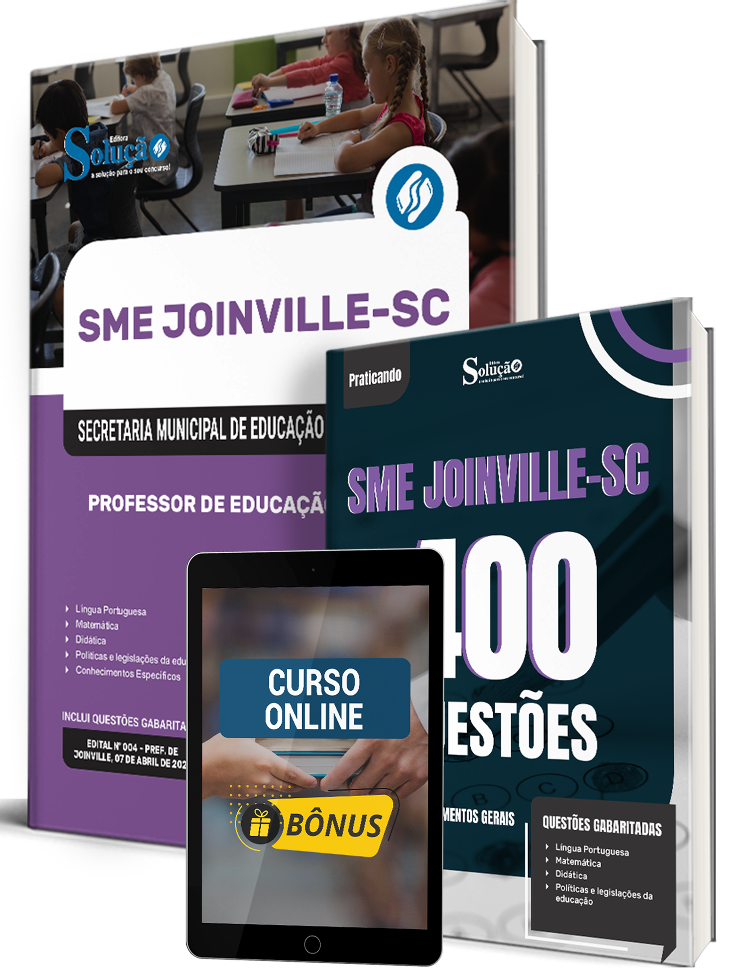 - Caderno de Questões SME Joinville-SC - Professor - Conhecimentos Gerais - 400 Questões Gabaritadas: traz questões cuidadosamente selecionadas pela nossa equipe editorial, de acordo com o edital mais recente do concurso.