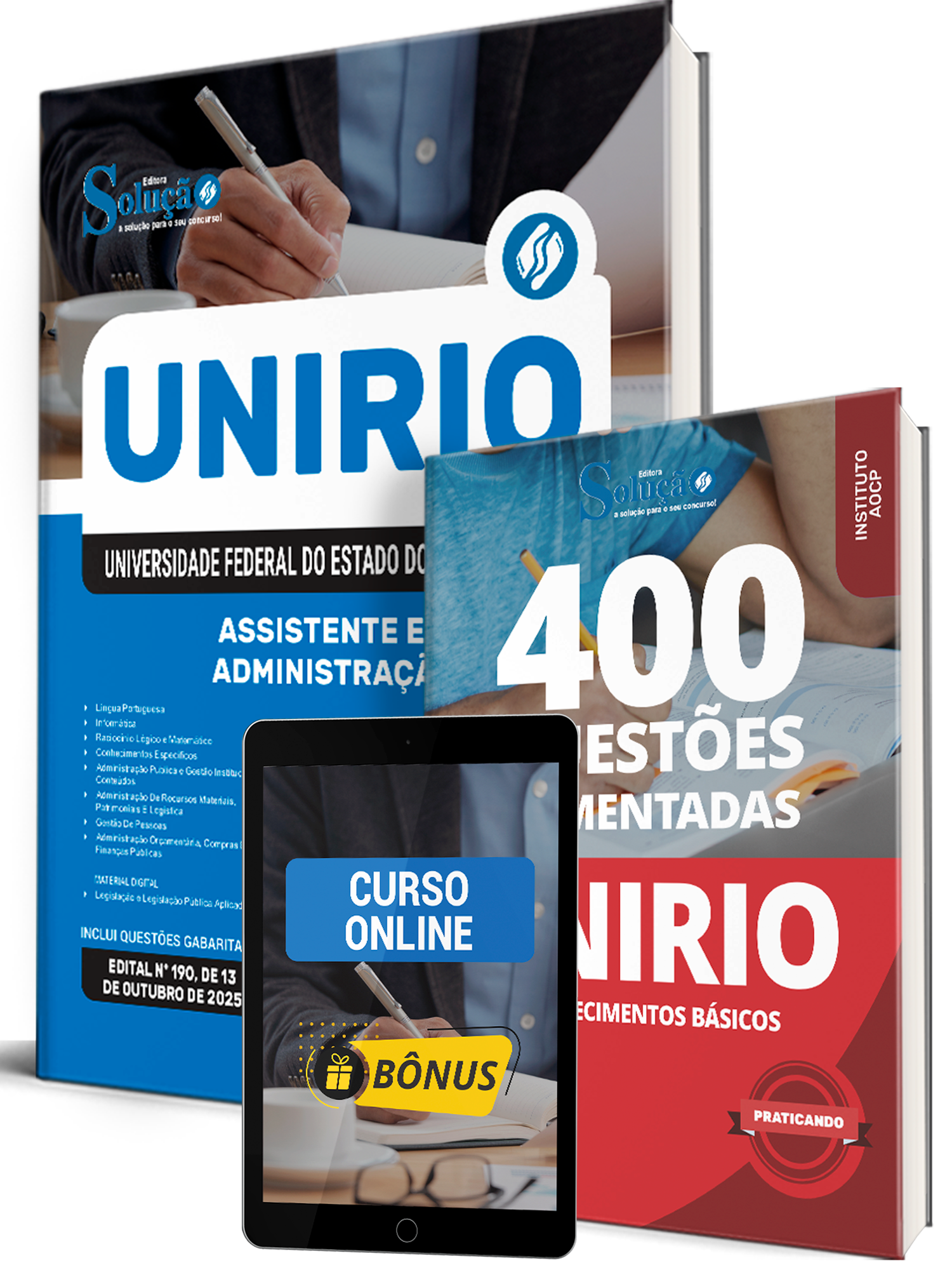 - Caderno de Questões UNIRIO - Conhecimentos básicos - 400 Questões Gabaritadas: traz questões cuidadosamente selecionadas pela nossa equipe editorial, de acordo com o edital mais recente do concurso.